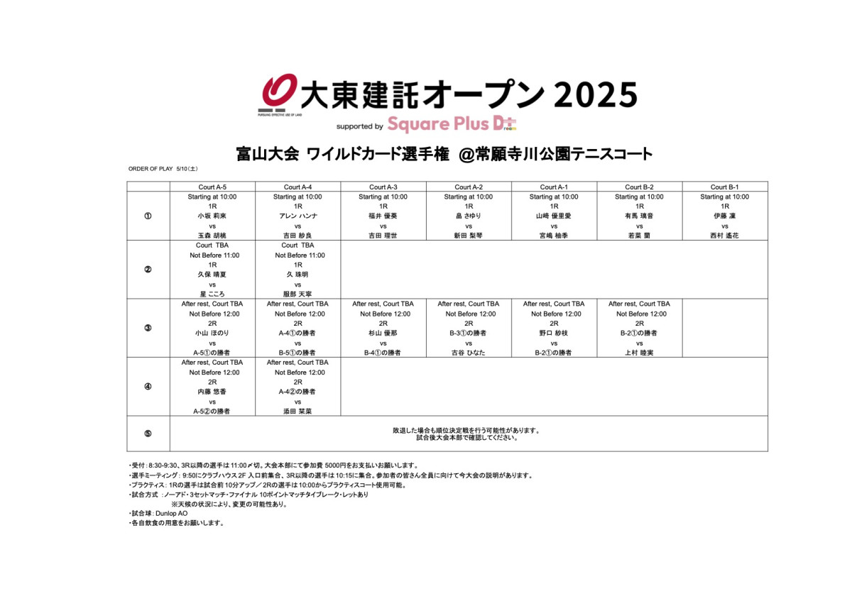 W15富山 大東建託オープン supported by Square Plus ワイルドカード選手権 Draw&OP発表